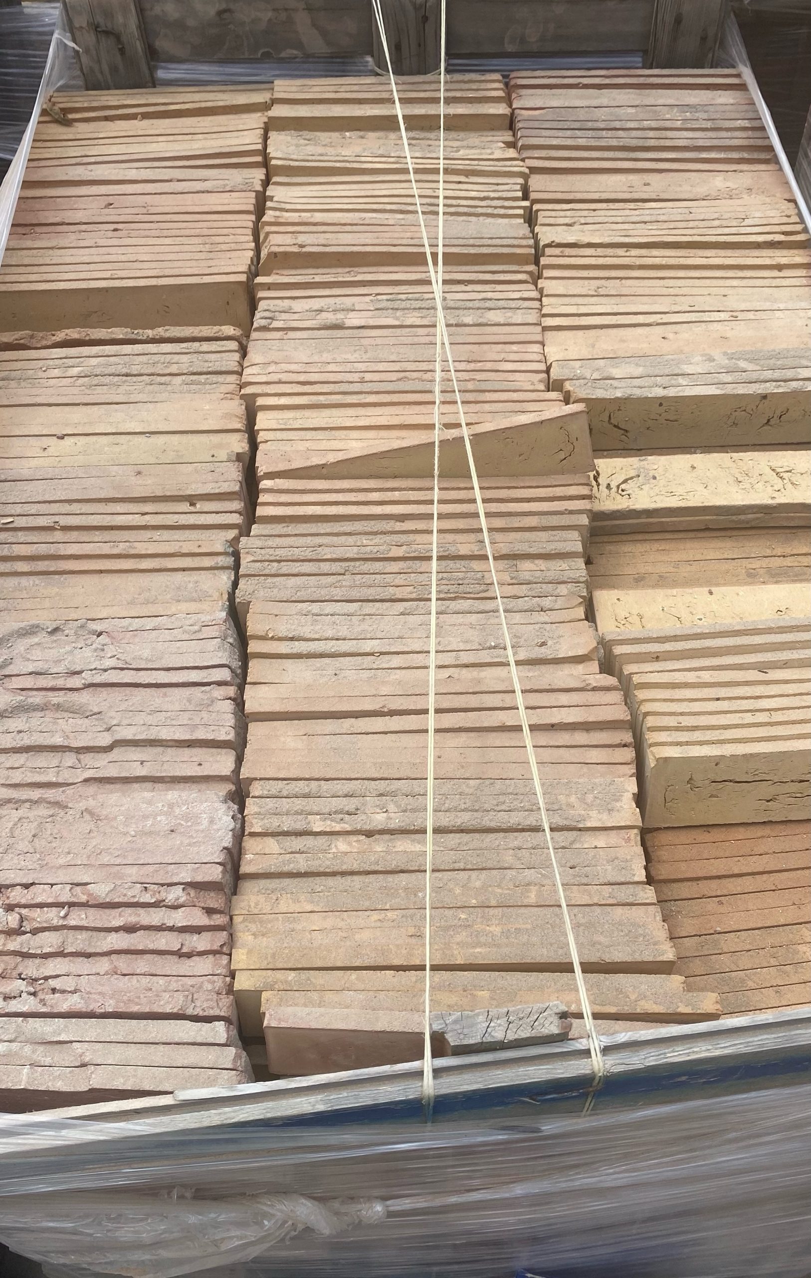 Amikor a bontott téglát megtisztítjuk, kötésben raklapokra rakjuk, és körbetekerjük fóliával, hogy ne boruljon le a szállítás közben.