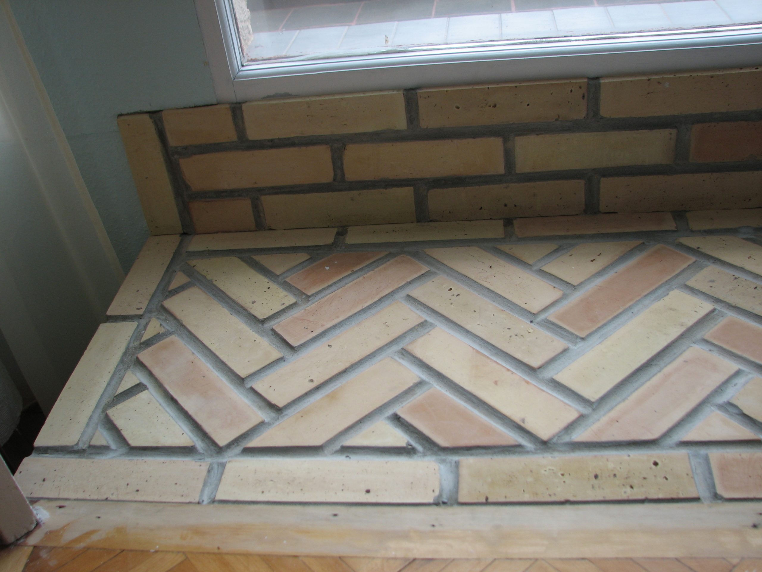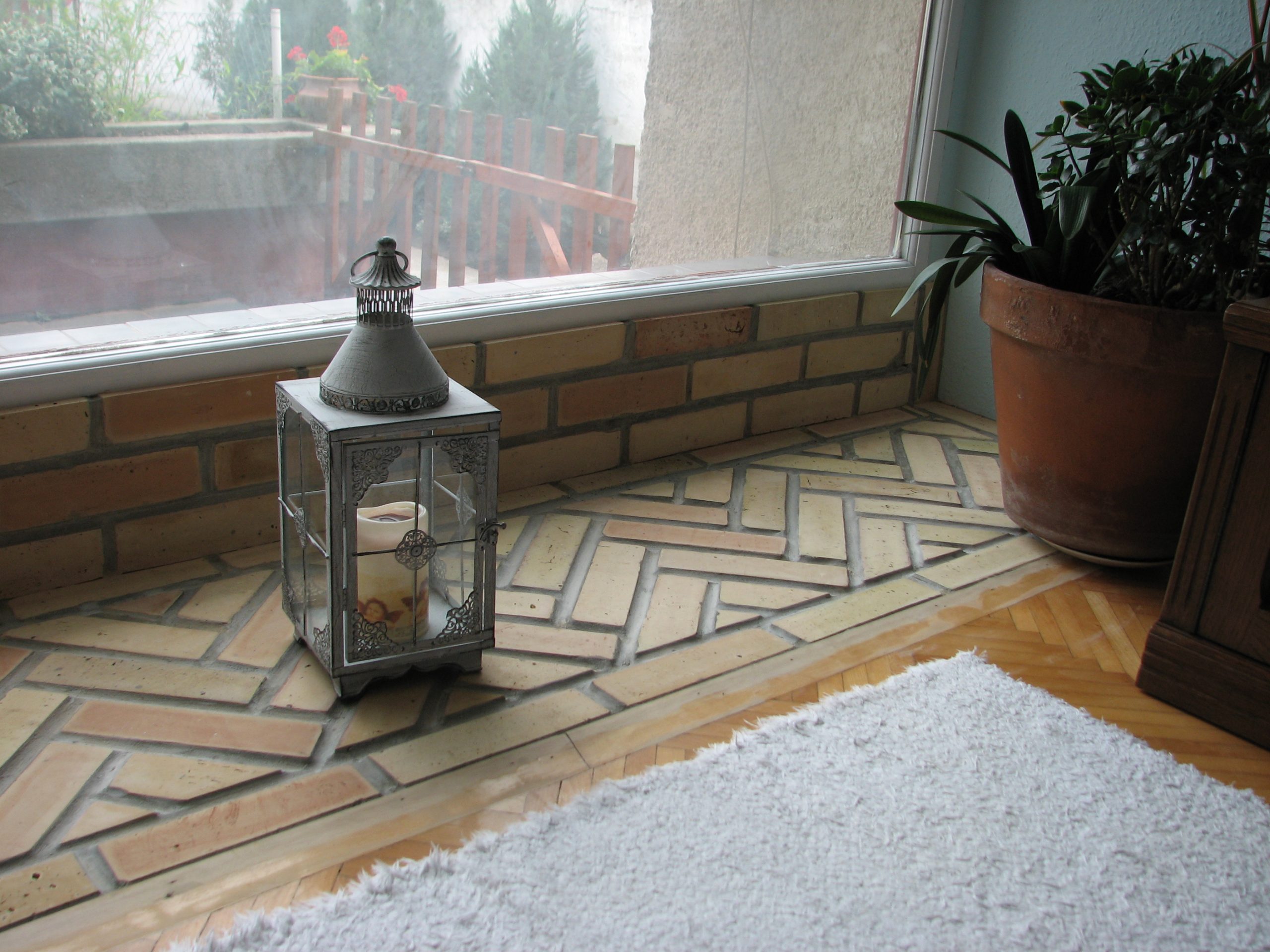 A régi, idejét múlt stílusú járólap helyett most a tégla szeletek díszítenek.
