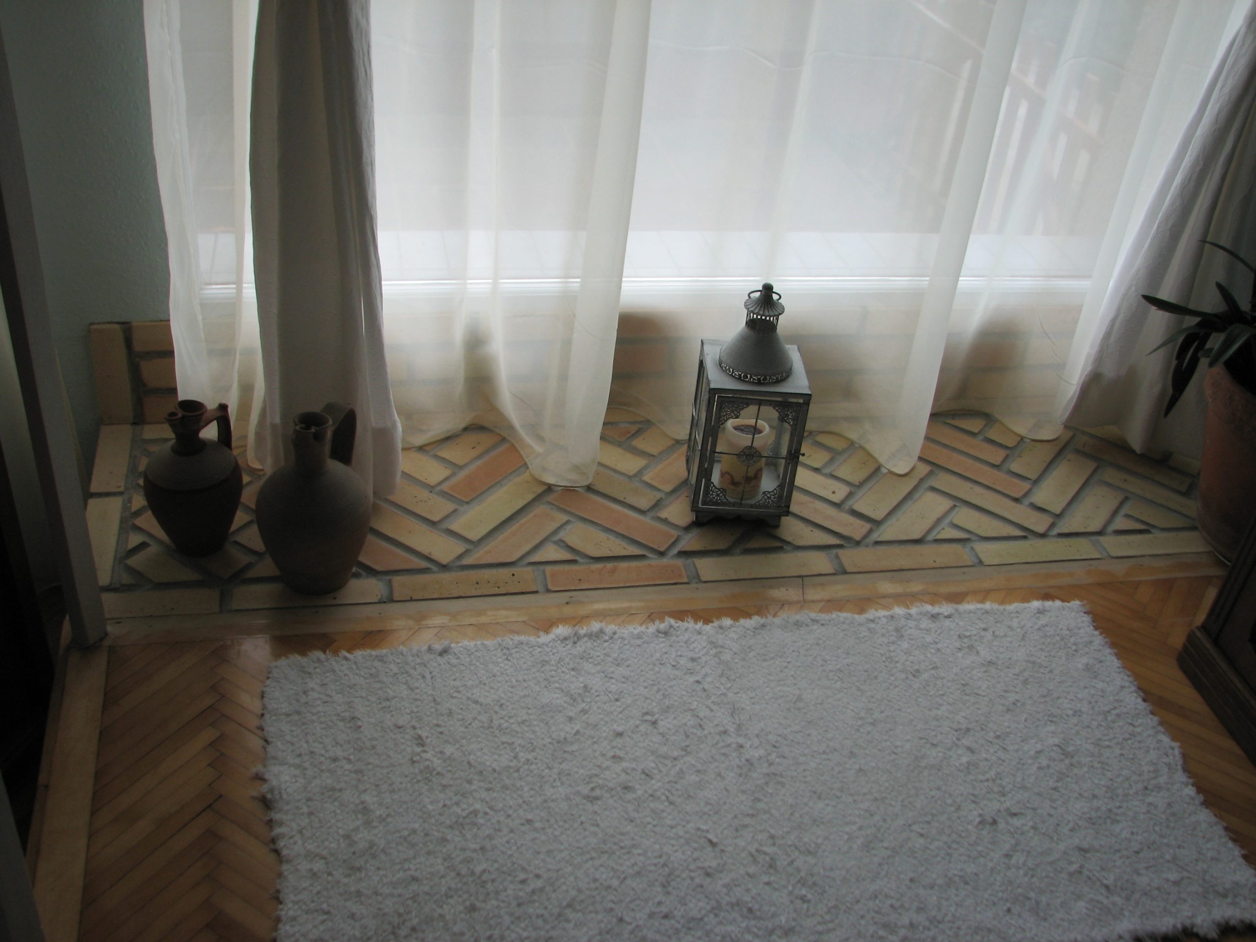 Jó ötlet volt a parketta halszálka mintáját folytatni a téglában is. Másik szép megoldás a körbefutó keret.