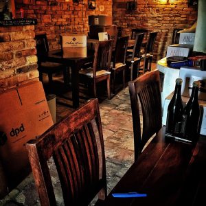 A falak, a burkolatok, a bárpult mind-mind nagyméretű bontott téglából készültek. A beépítés stílusa és a szép munka a tulajdonos jó ízlését dícsérik.