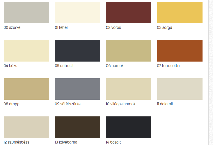 Amit mi forgalmazunk, jelenleg 5 színben kapható, +2 színben rendelhető. (Készleten: szürke, fehér, dolomit, bézs, drapp, Rendelhető: terrakotta, sárga).