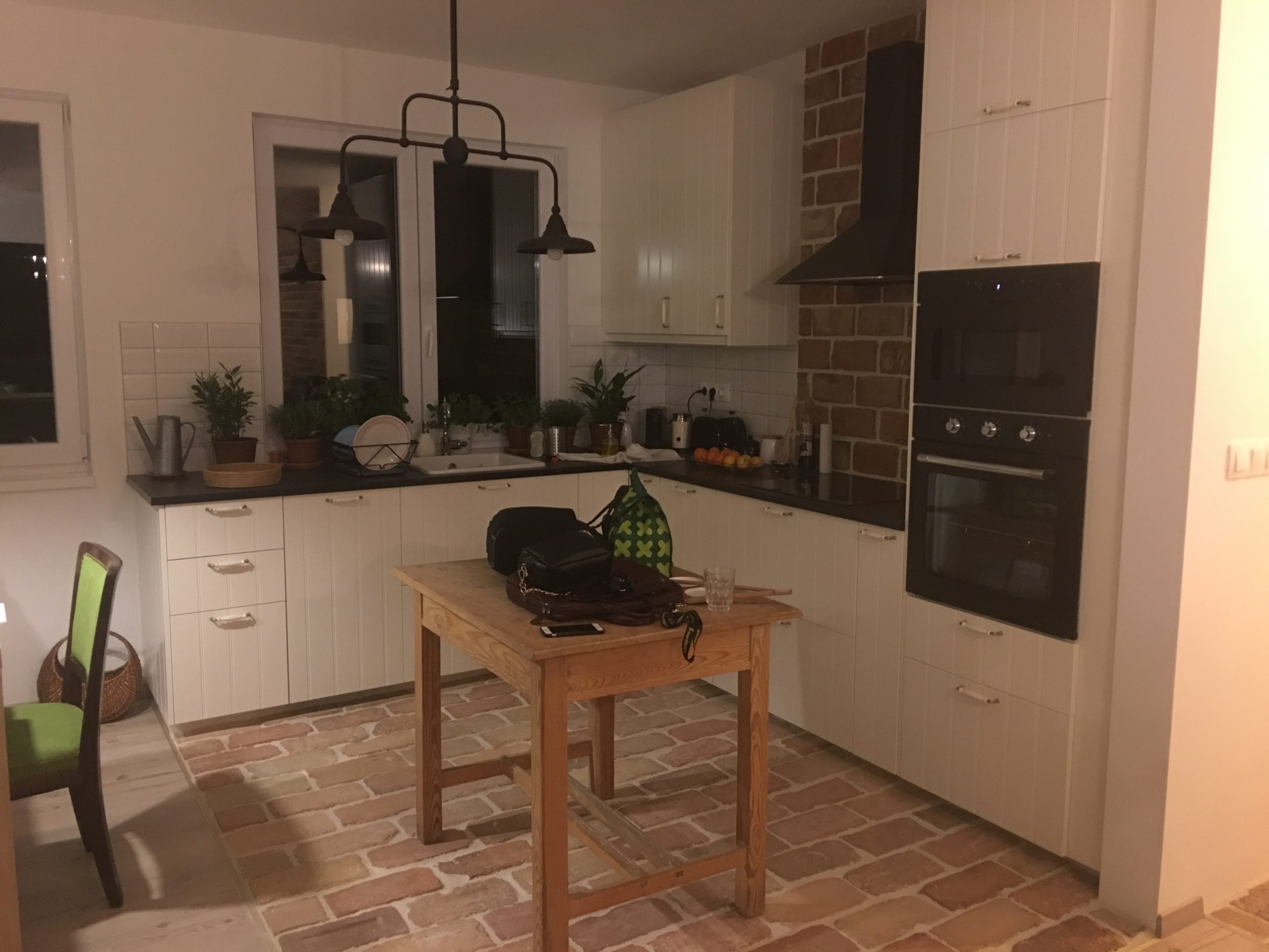 Az egyik lakásban egy konyha padlóját burkolták tégla szelettel, és nagyon szépen sikerült a kivitelezés is.