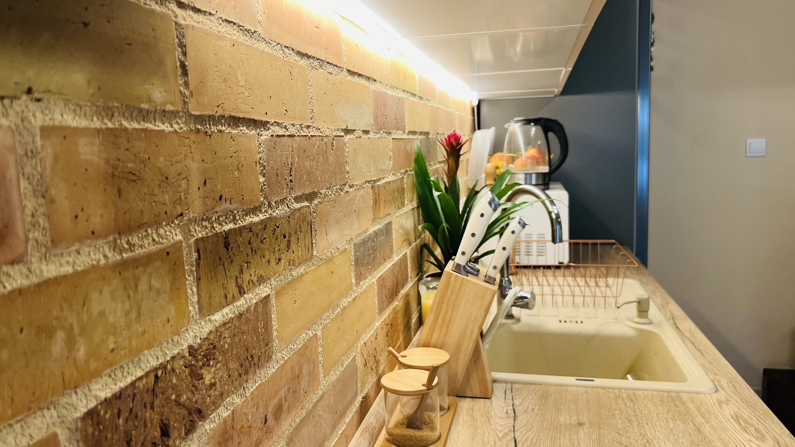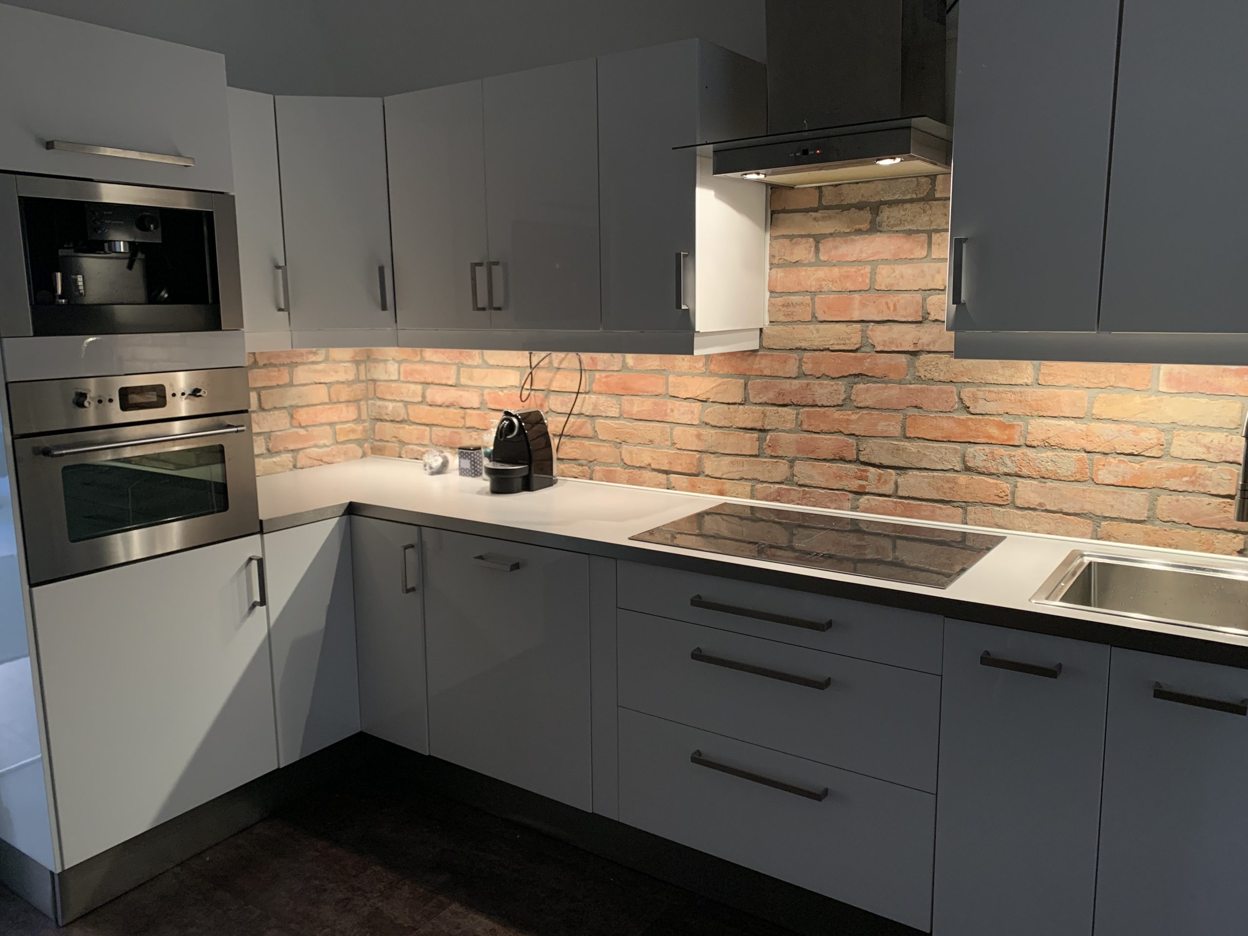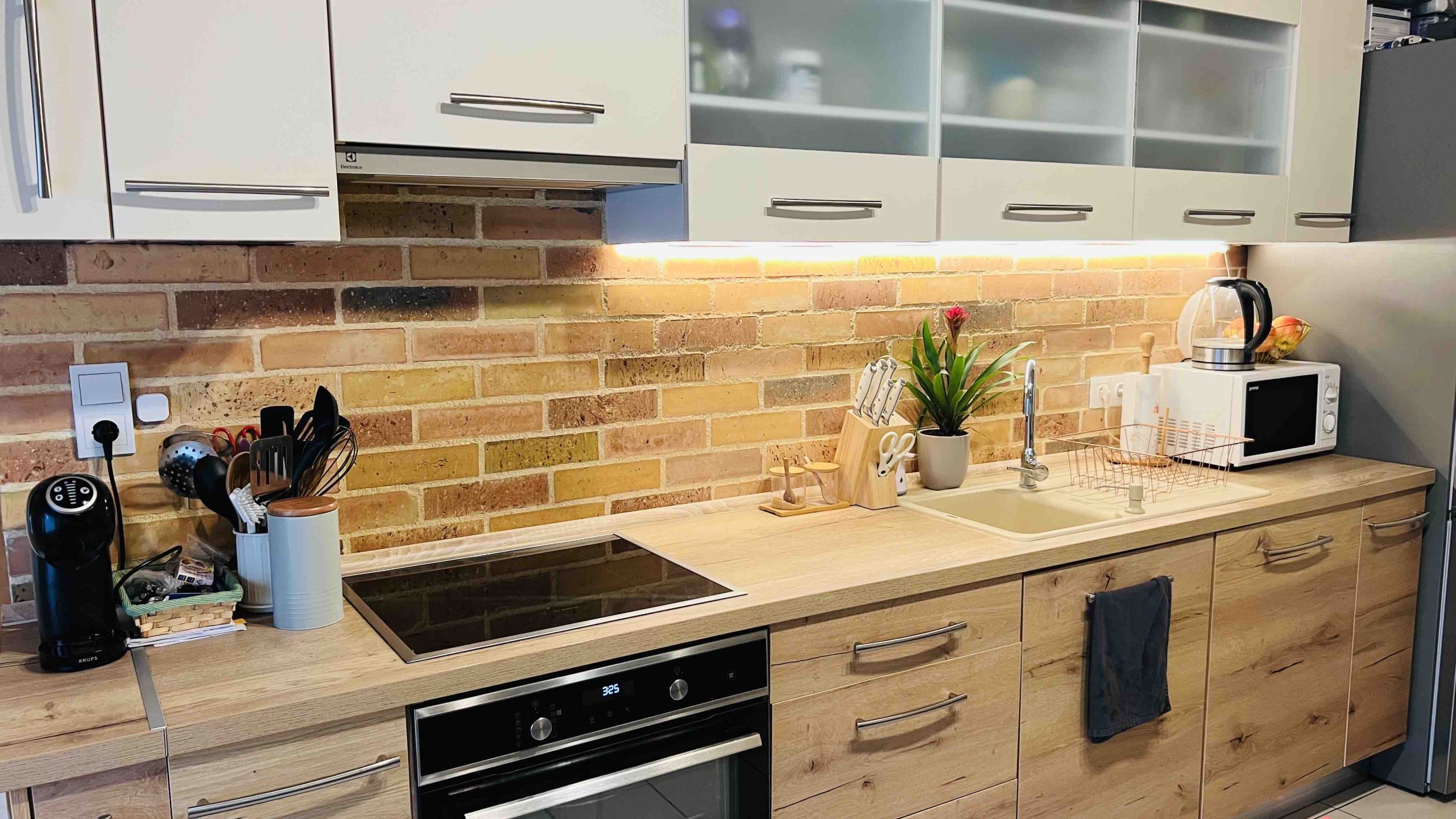 A másik kedves vásárlónk konyhai munkapult és felsőszekrény közötti sávot burkoltatta tégla szeletekkel, és amint a képeken is látható, ott is nagyon jól megállja a helyét a tégla, meleg, barátságos színével és hangulatával.